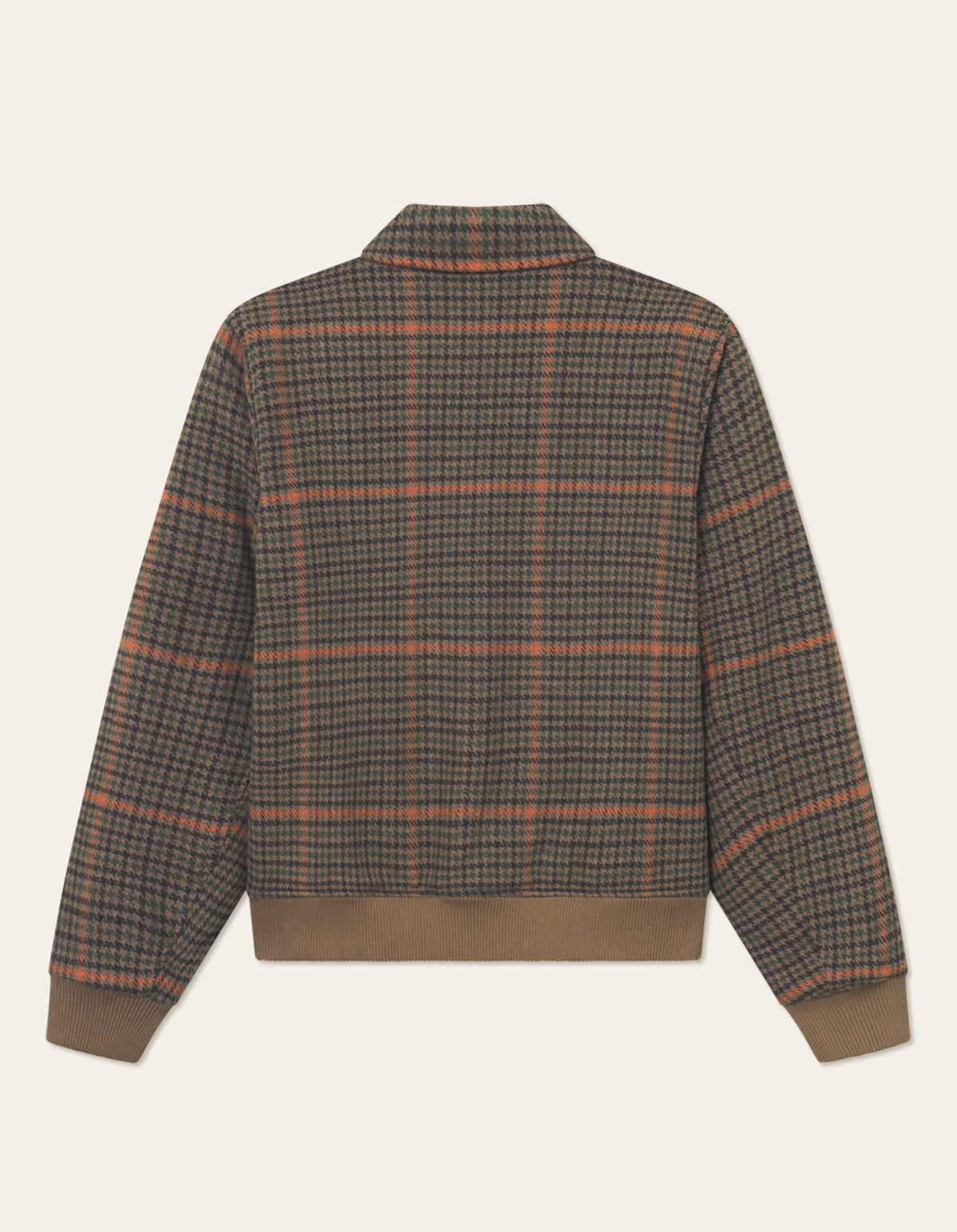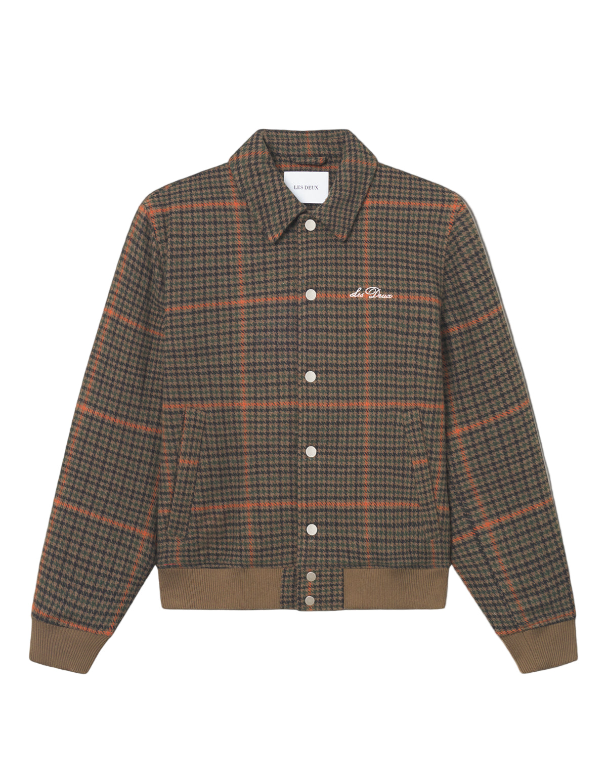 The Varsity Houndstooth Jacket reworks a campus classic in heavyweight wool blend, finished with subtle embroidery and a ribbed trim that hits the sweet spot between sharp and laid-back.