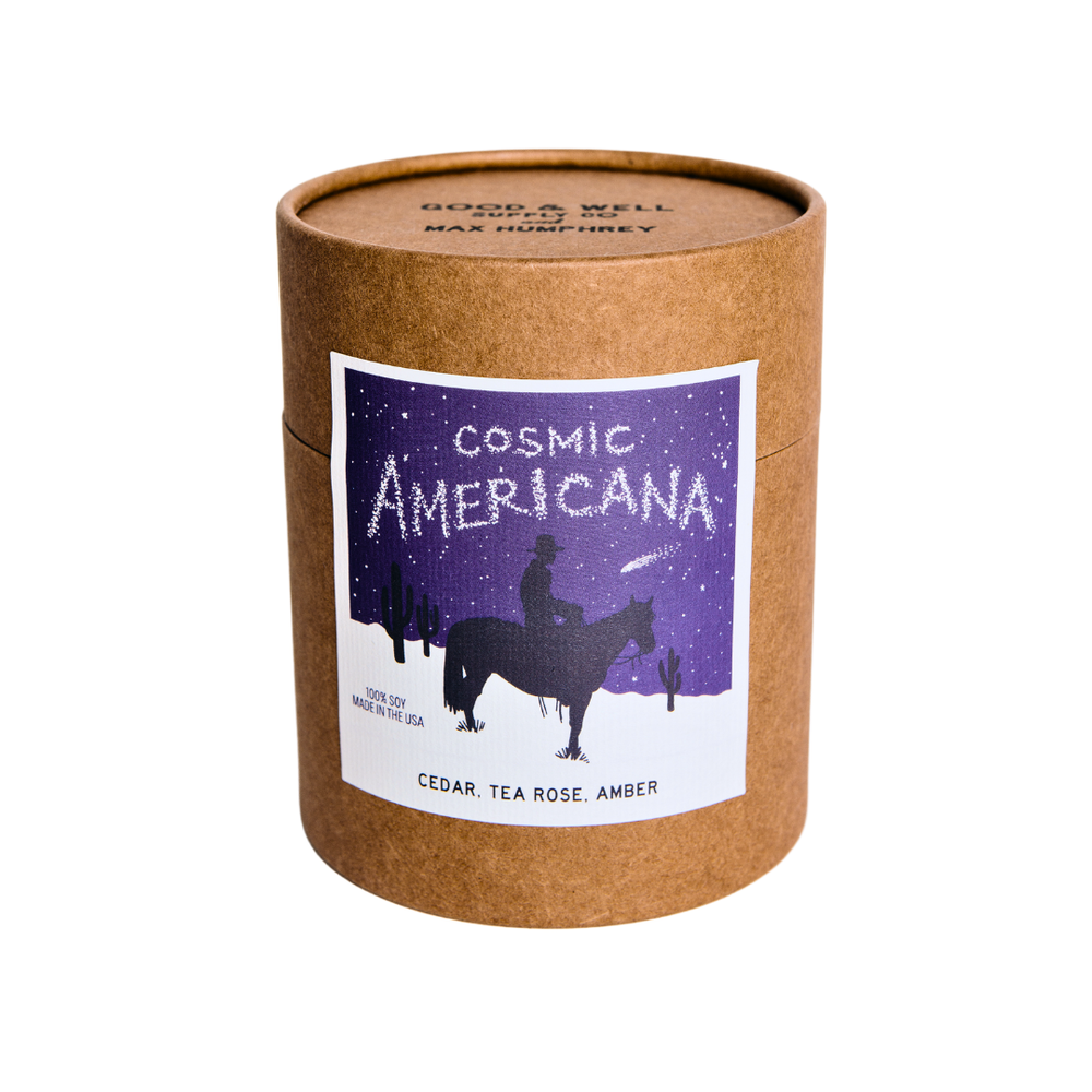Notes of cedar, tea rose & amber. A candle collection created in collaboration with our friend, Portland interior designer Max Humphrey. United by mutual love for Americana, cozy lodges and cowboy stuff, Max and Good & Well came together to capture the essences of the untamed American frontier. 12 oz glass soy candle with cotton wick.