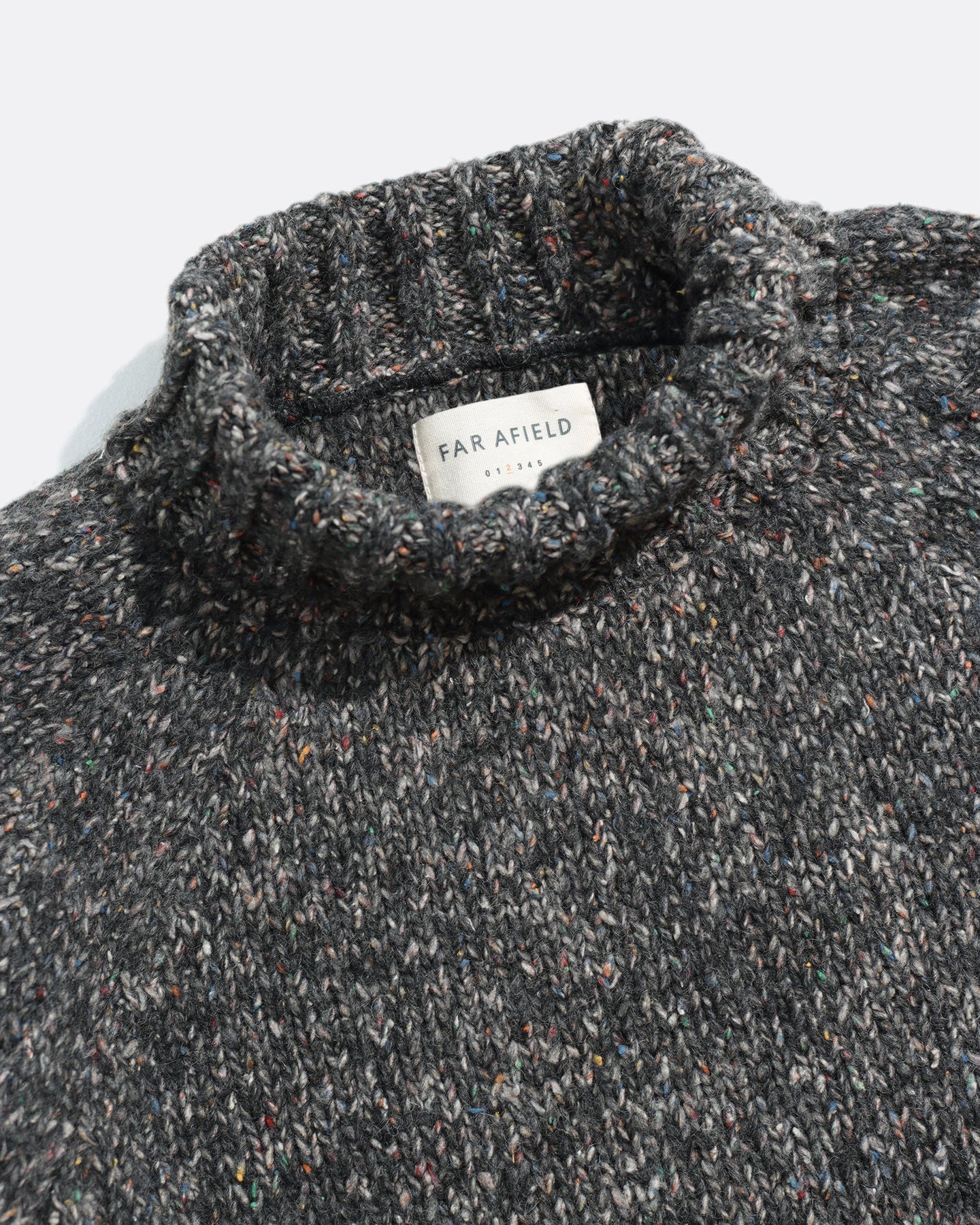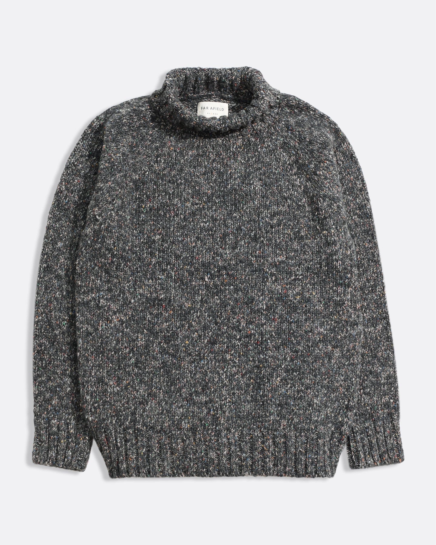 A heavyweight roll-neck jumper built for cold weather. Knitted with raglan sleeves and a dense nepped yarn that mixes multiple tones, it takes cues from traditional fishermen’s knits made to withstand long days at sea. Integral ribbed roll-neck, cuffs, and hem complete a piece designed for warmth and lasting comfort.
