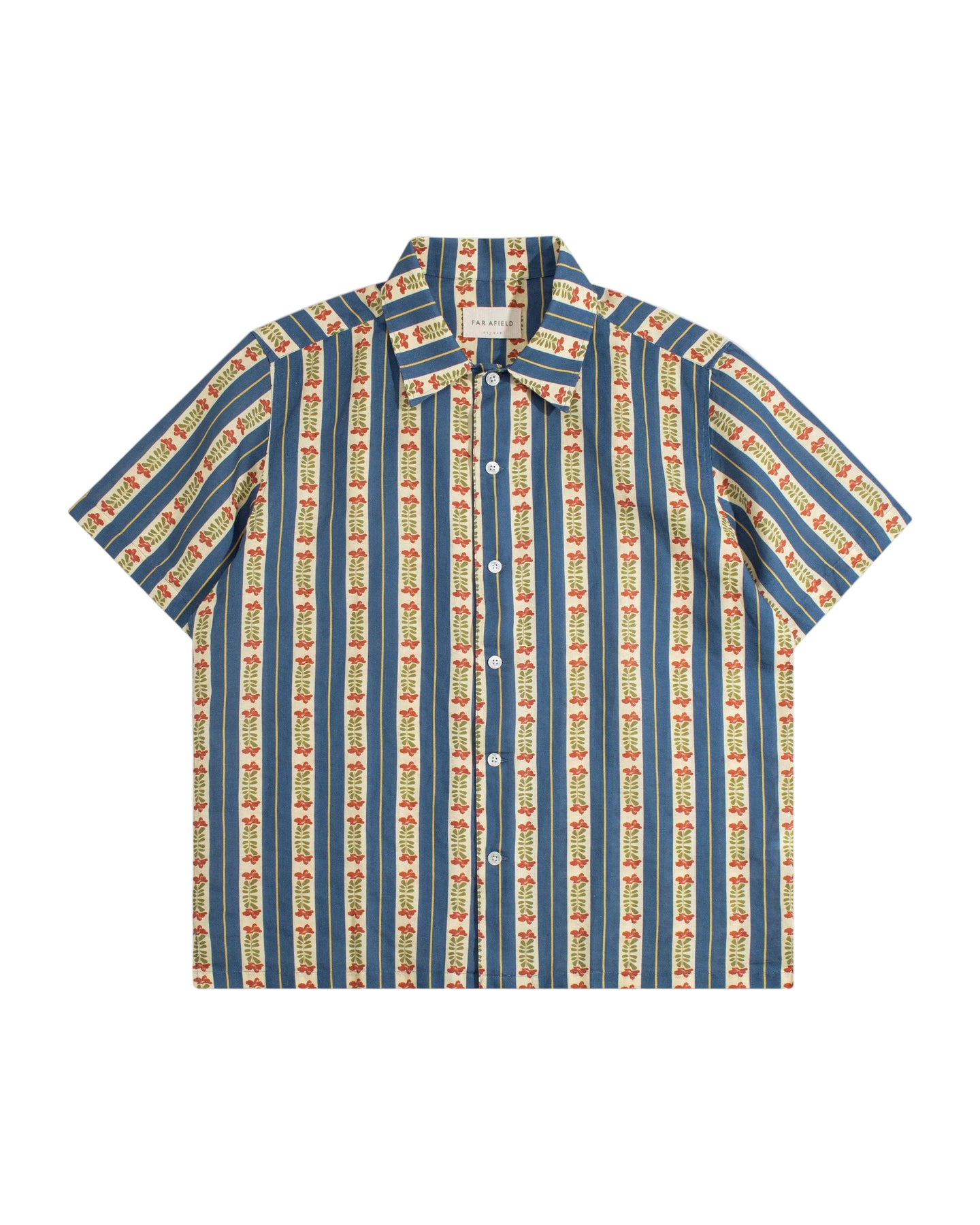 Slightly cropped, boxy short-sleeve shirt in a breathable cotton–linen blend, finished with vertical stripes and delicate tropical floral detailing.