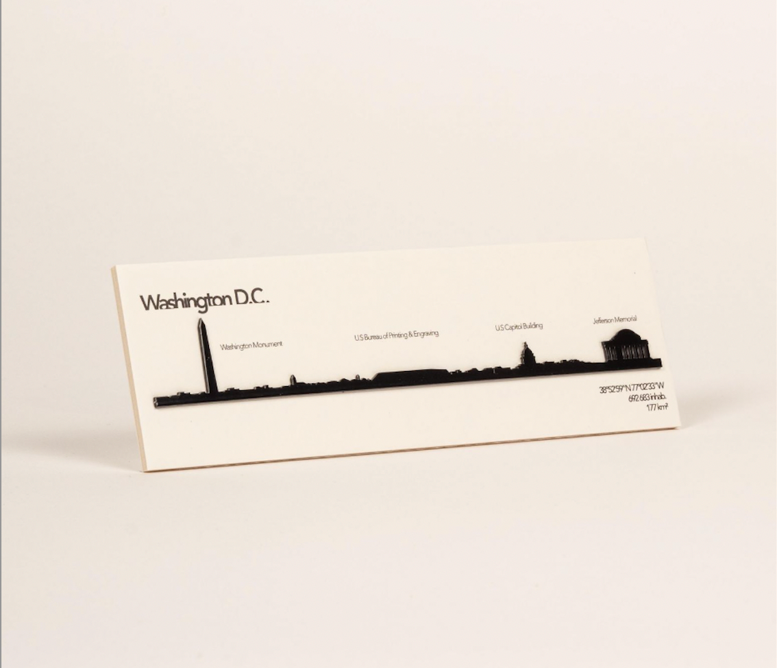 The Line Mini is magnetic and can be attached any magnetized surface. You can stick and move the line according to your mood and display it on various surfaces without putting holes in the wall. Measuring at 7.5" wide, it comes in a flat gift box, perfect small souvenir or gift from you travels. Item Description: Wall-mountable city silhouette, two adhesive magnets, gift-boxed Material: Black painted laser cut steel, magnetized. Recycled cardboard packaging. Dimensions: 7.5” long Made in: France