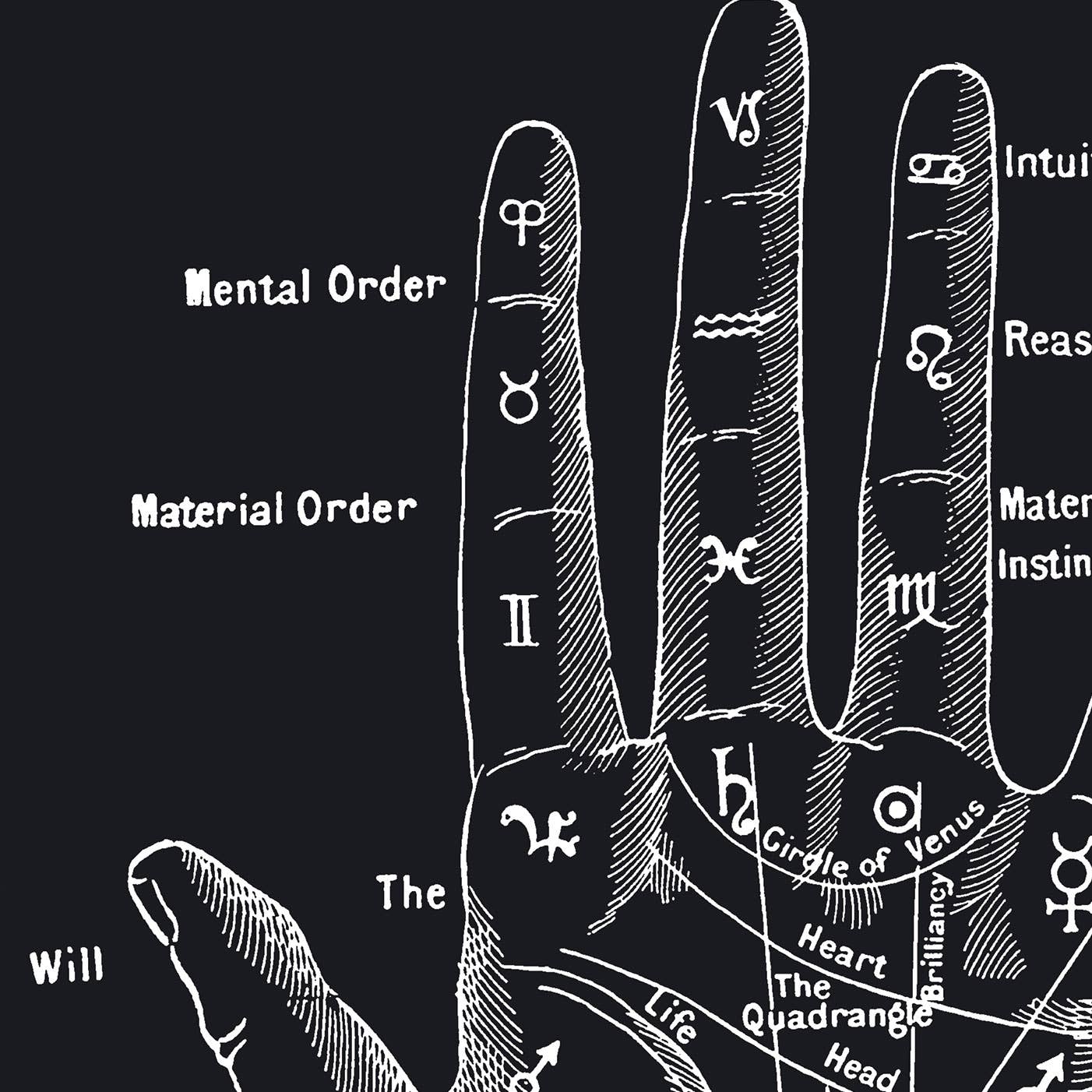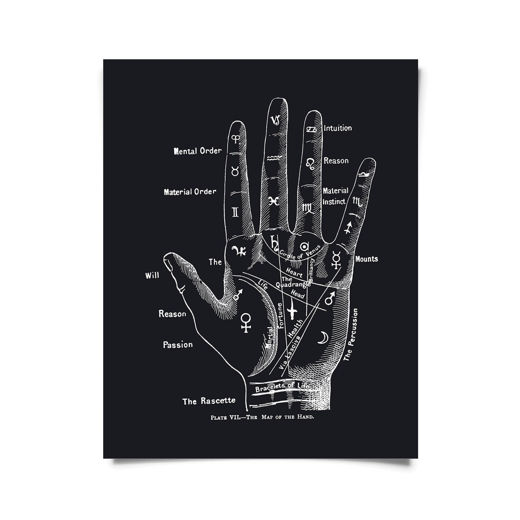 Curious Prints creates high quality reproductions of your favorite vintage art. This print features a reproduction of a vintage palmistry print. The art has been scanned and retouched to ensure the highest quality reproduction possible. The art is digitally printed on sustainably produced 100% cotton fiber archival paper. Each print is packaged in a sealed clear sleeve with matte backing and includes an info card with the history of the art.